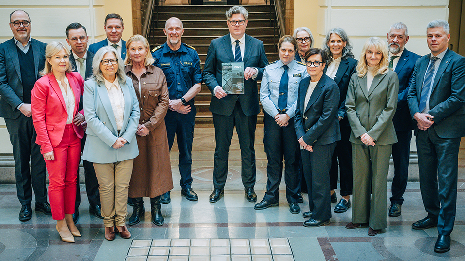 På bilden syns generaldirektörer och myndighetschefer för myndigheterna som samverkar mot organiserad brottslighet samt i mitten justitieminister Gunner Strömmer.